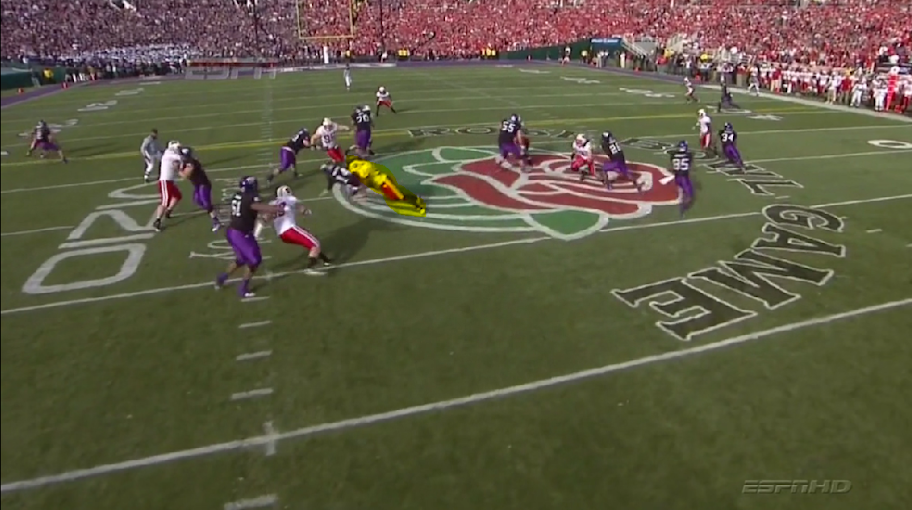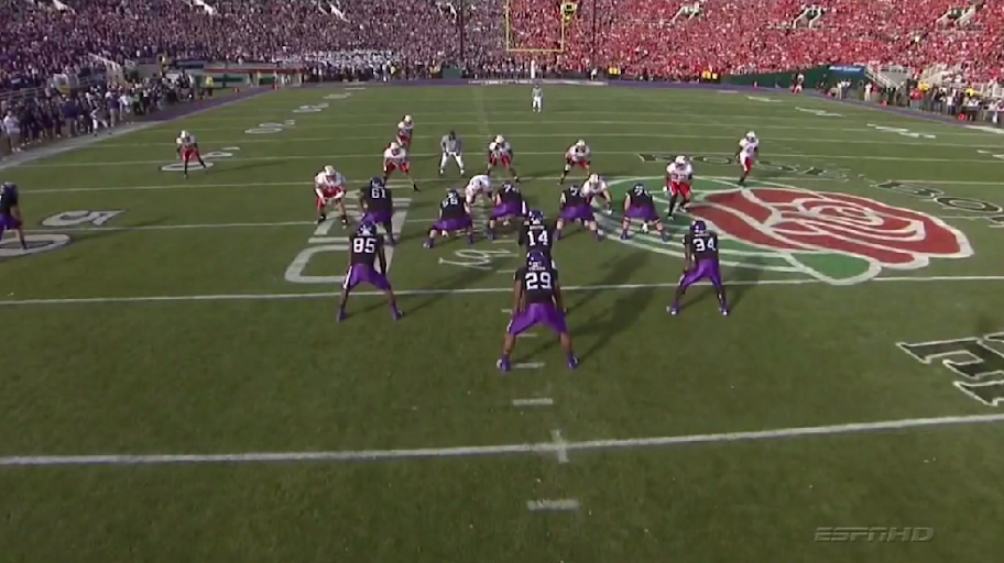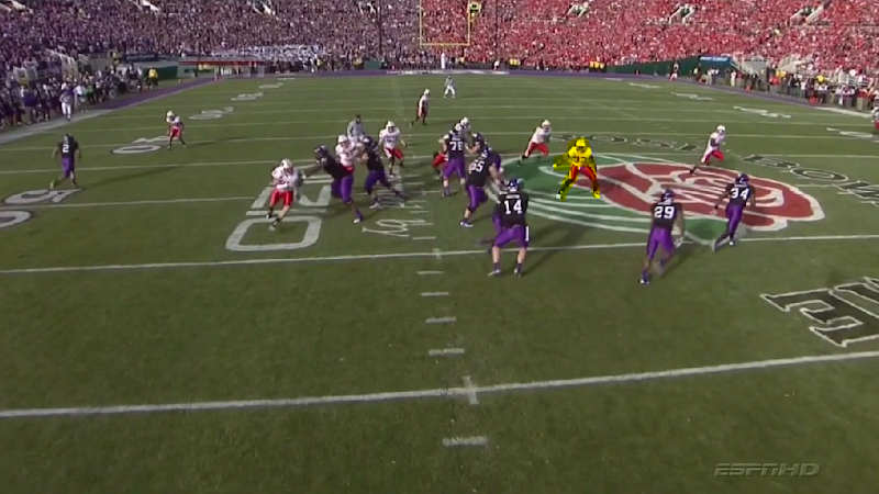 The play action pass that OSU showed was a simple vertical route by the two split ends, while the backs showed an inside zone action.