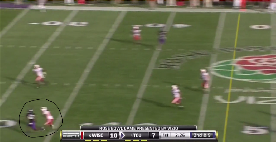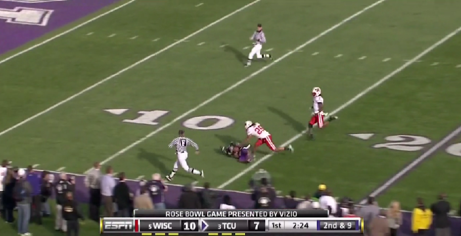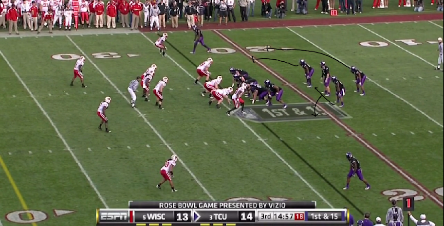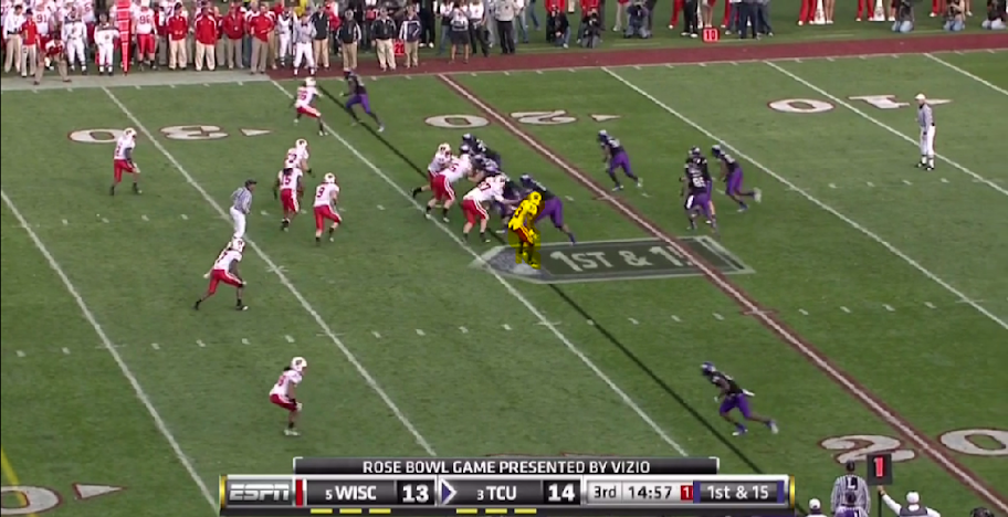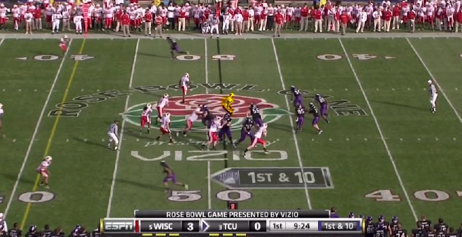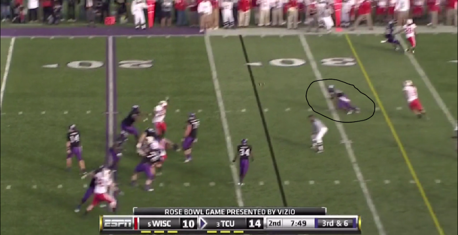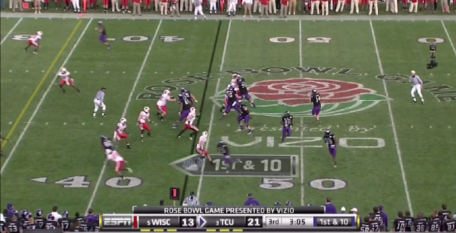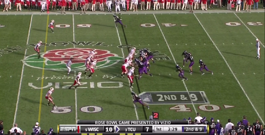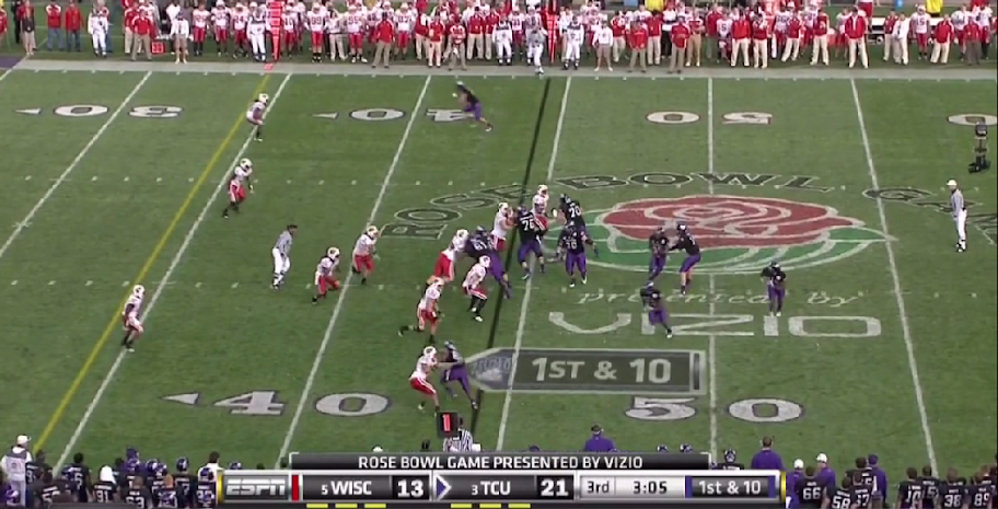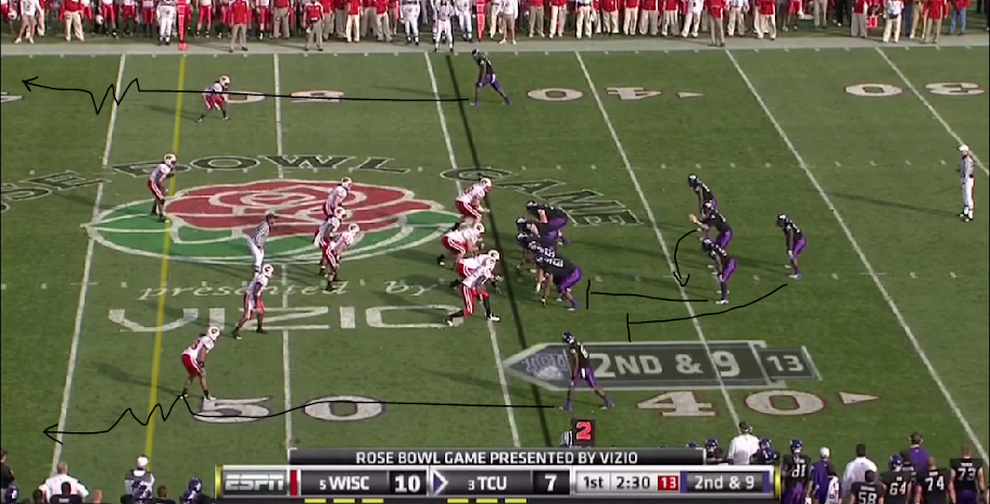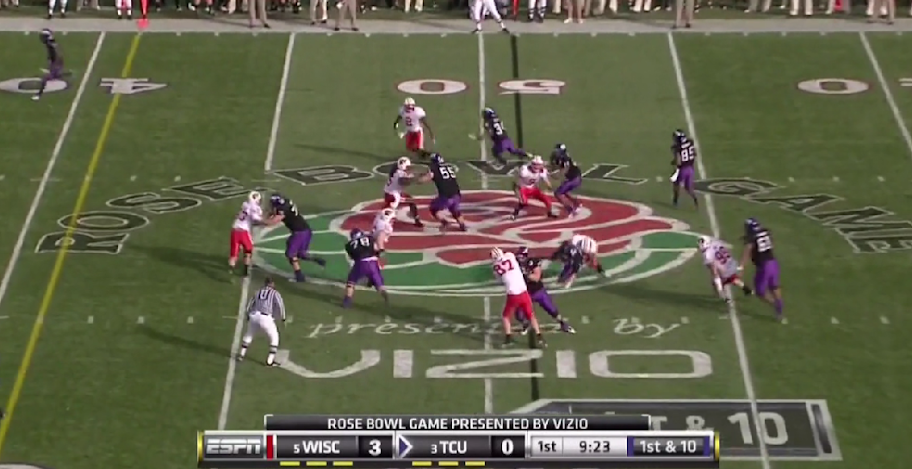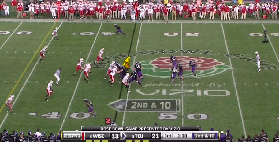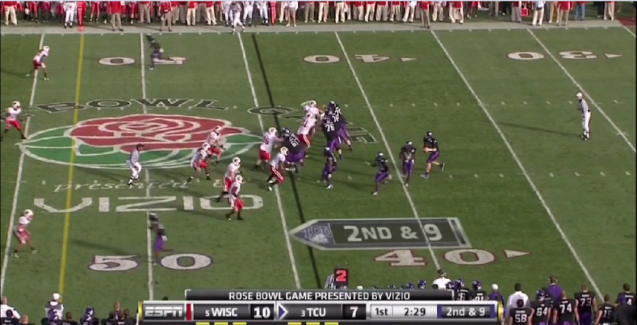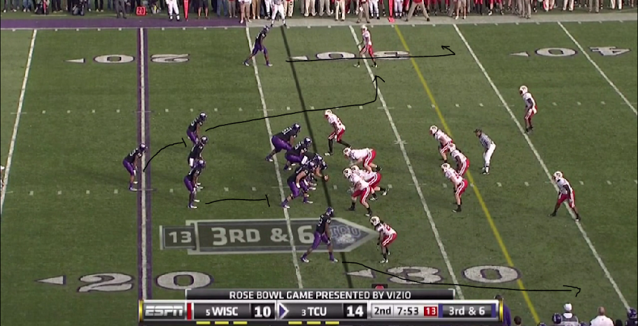 Here is TCU's version of the outside zone, with a read on the backside defensive end. They execute it the same as OSU with the tailback and one halfback leading for the other.