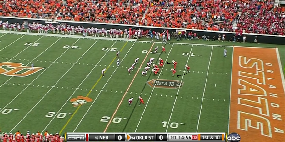 Oklahoma State also showed an outside zone out of this set to one of the half backs, with the other half back and tail back leading on the play. The halfback will cross in front of the QB and receive the hand off. This is really no different than any other shotgun outside zone play except for the ability to get another lead blocker out in front of the runner with having the tailback.
